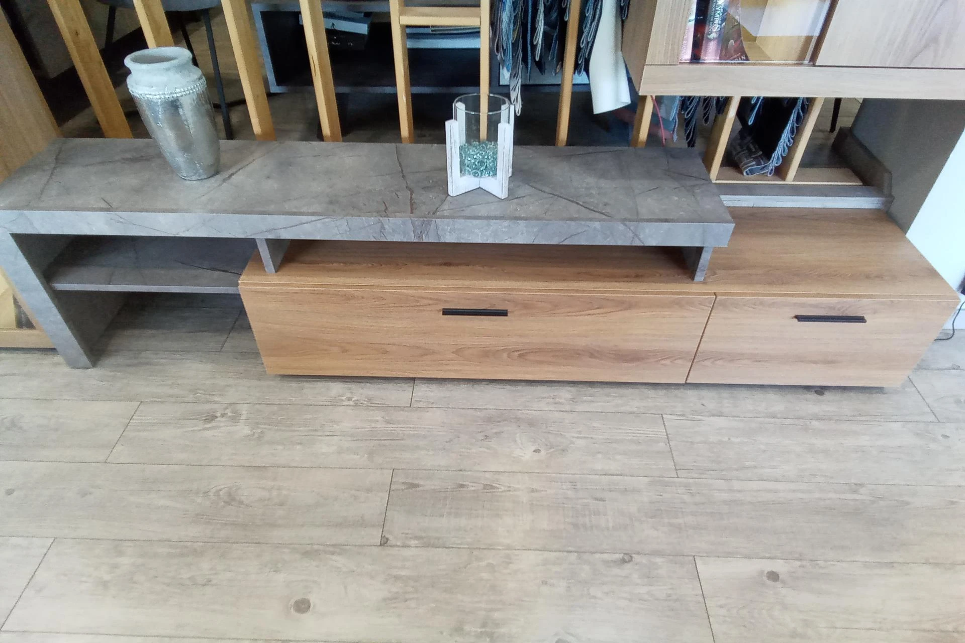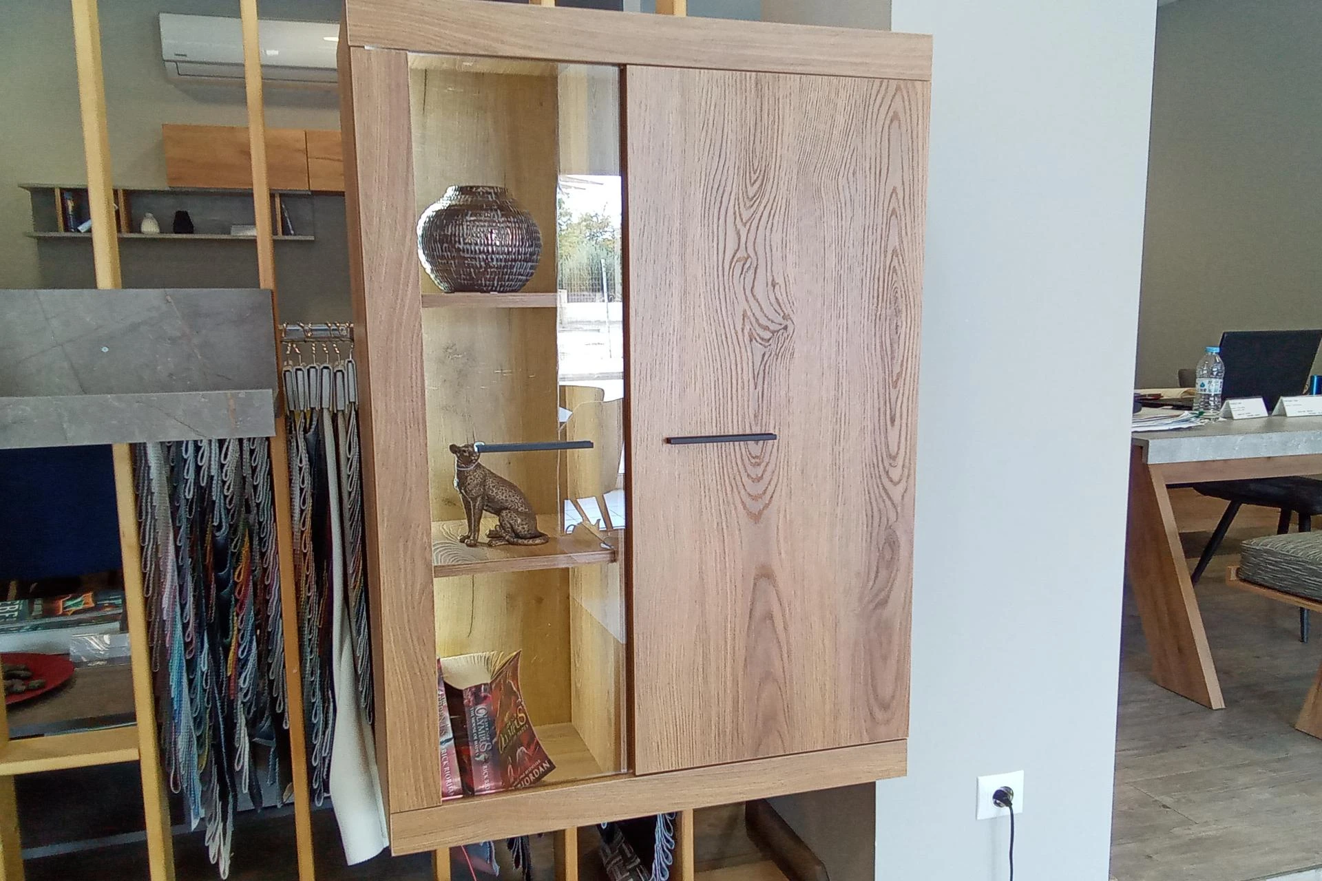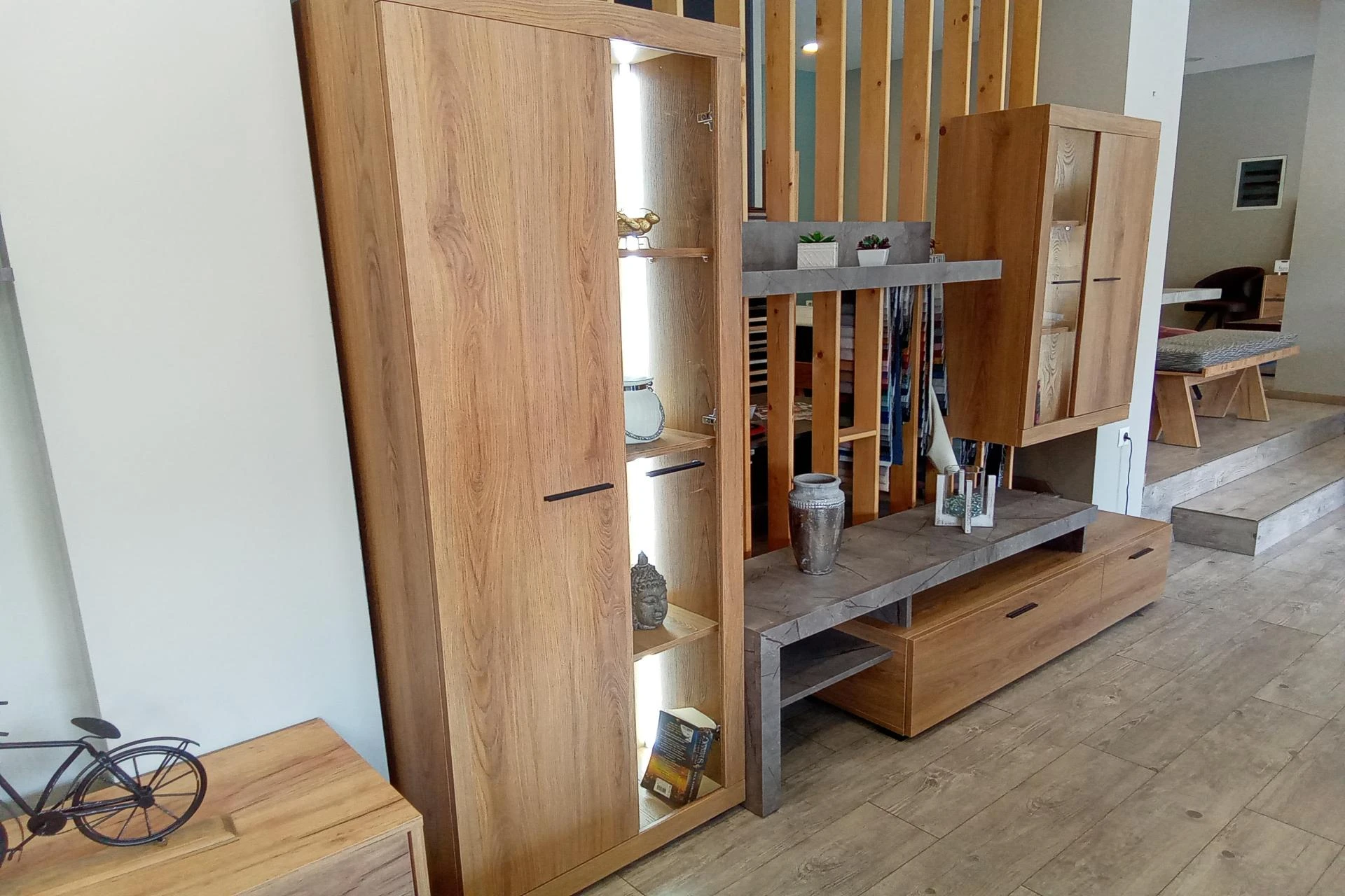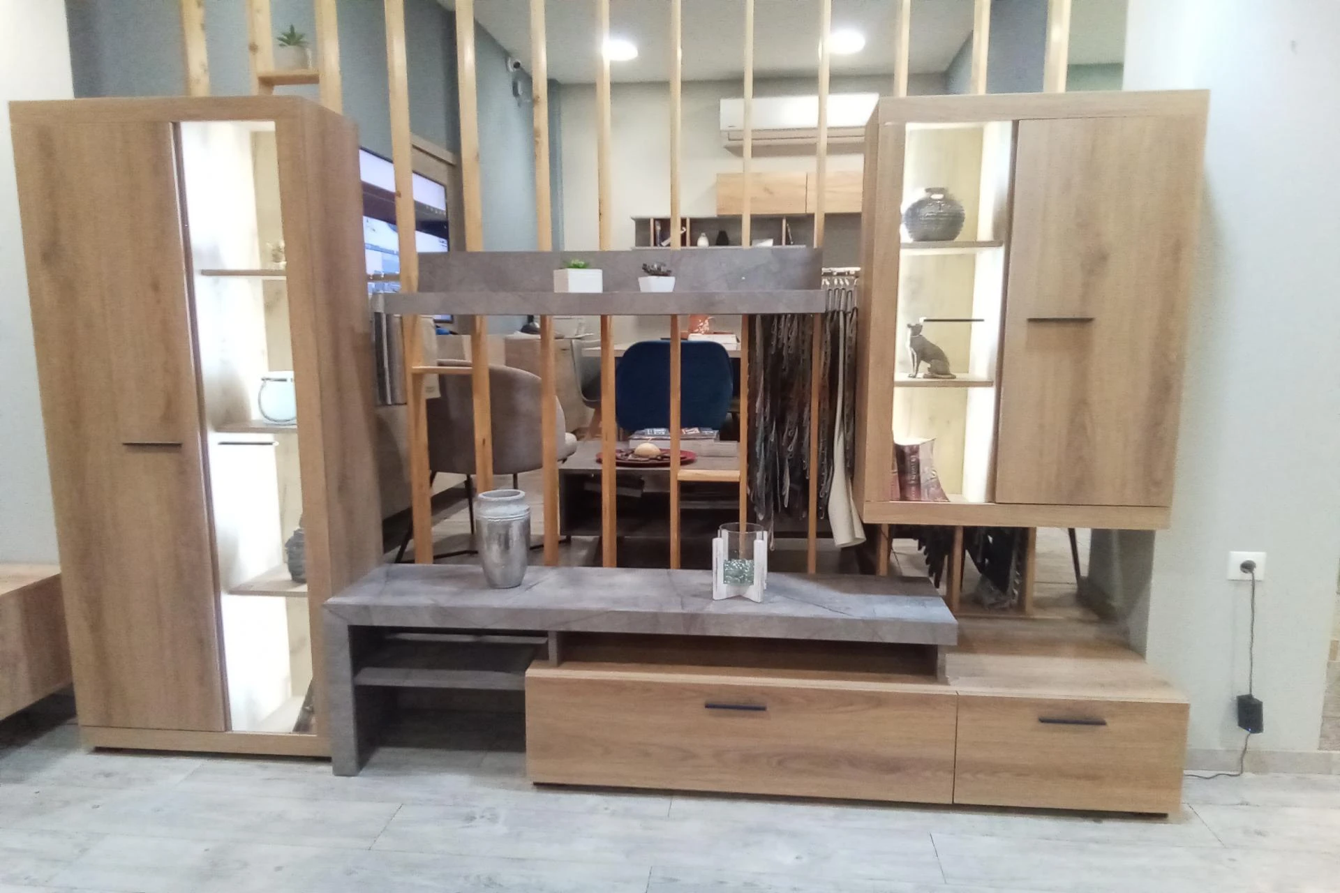 Η βάση της τηλεόρασης διαθέτει ντουλάπια και αποθηκευτικό χώρο στις δύο μεγάλες βιτρίνες, μία δαπέδου και μία επιτοίχια.