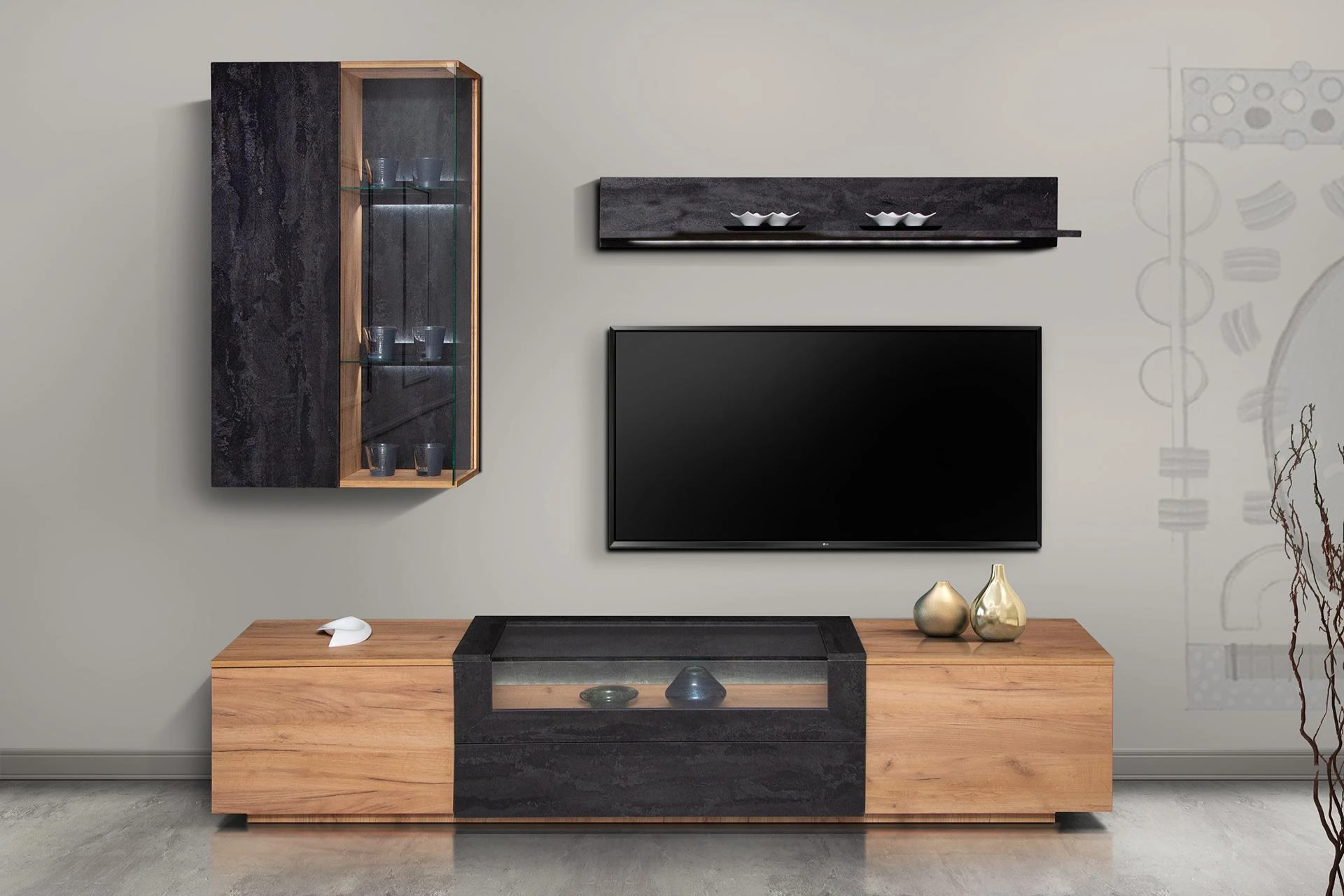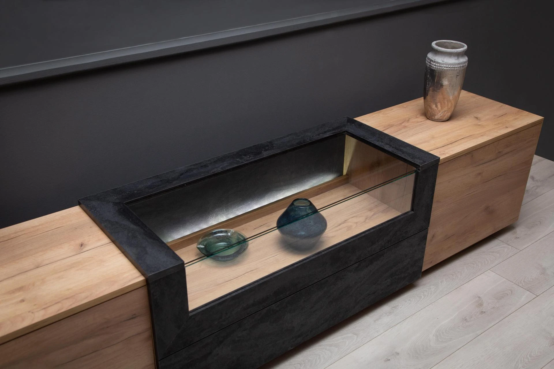 Οι γραμμικές και ιδιαίτερα μοντέρνες βιτρίνες της σύνθεσης Περσεφόνης, με την προσθήκη του κρυφού led φωτισμού θα σας προσφέρουν την δυνατότητα όχι μόνο να αποθηκεύσετε τα αγαπημένα σας αντικείμενα και διακοσμητικά αλλά και να τα αναδείξετε με τον καλύτερο τρόπο.