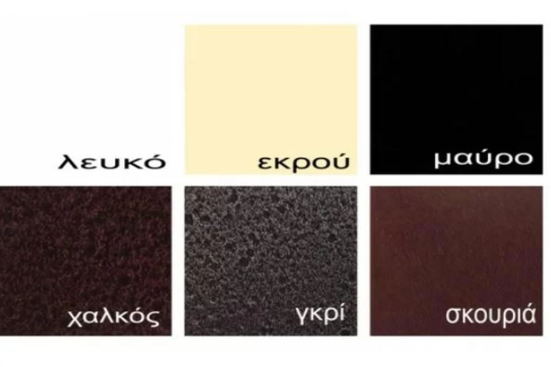 Διατίθεται σε 6 χρώματα: ΛΕΥΚΟ, ΕΚΡΟΥ, ΜΑΥΡΟ, ΧΑΛΚΟΣ, ΓΚΡΙ, ΣΚΟΥΡΙΑ.