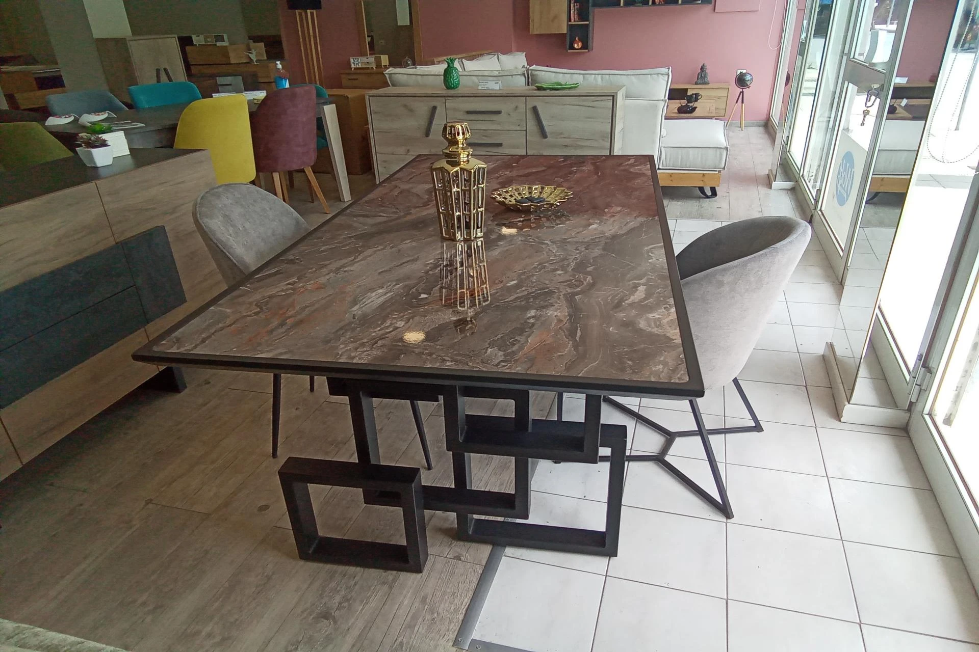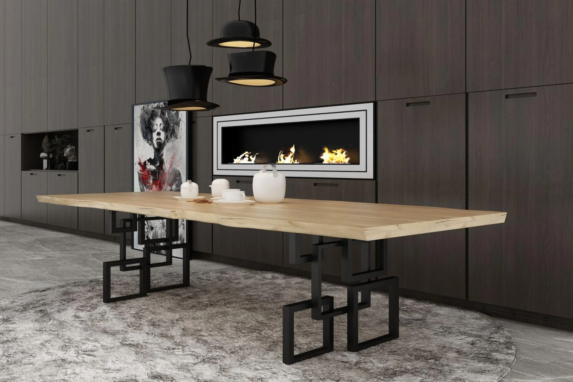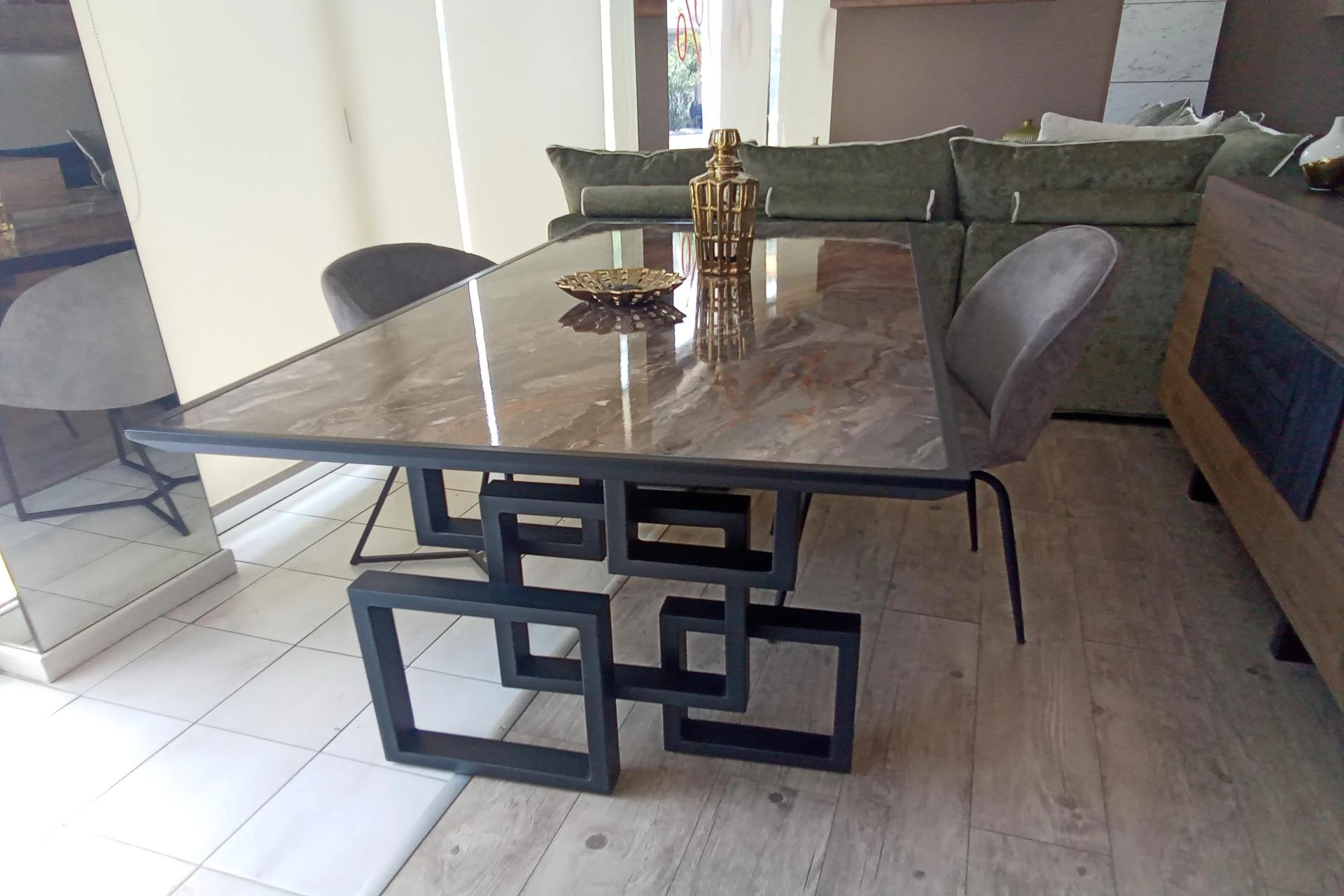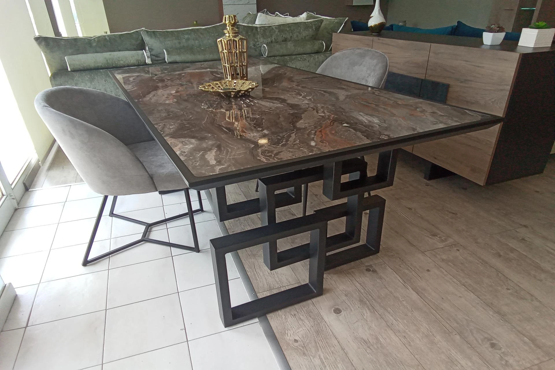 Ιδιαίτερη και μοντέρνα τραπεζαρία με πρωτότυπο σχέδιο στα πόδια με μεταλλικά τετράγωνα.